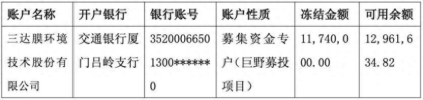11月5日晚间,三达膜(688101)发布公告,2025年11月5日公司接到募集资金存放银行告知,公司在交通银行厦门分行开设的募集资金专户的部分资金被法院冻结。经初步核查,公司募集资金专户被冻法院冻结金额为11,740,000.00元。
