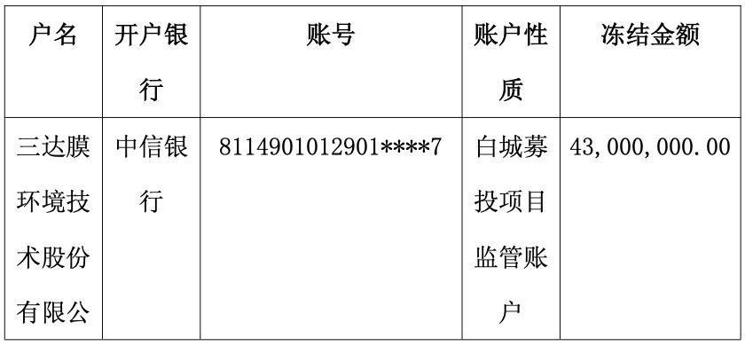 三达膜还表示,截止本公告披露日,除上述银行账户被冻结情形外,公司及下属子公司其他银行账户均不存在被司法冻结的情形。目前公司及下属子公司银行账户被申请冻结金额为98,817,933.28元,占公司最近一期经审计净资产的2.44%。公司将合理安排和使用资金,降低上述事项对公司的影响。